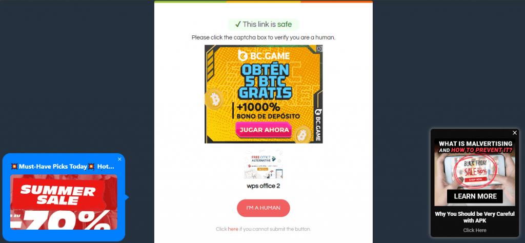 Ahora hacemos clic en el botón que dice I´M A HUMAN (Al hacer clic pueden abrirse ventanas emergentes, deberán cerrarlas todas, siempre deben permanecer en la página del acortador).
