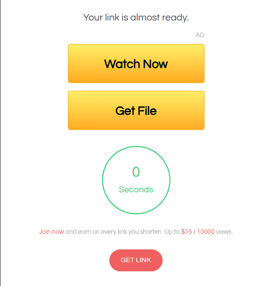 Sea cual sea el caso, al verificar que somos humanos, la página del acortador se recargará y aparecerá un contador que debemos dejar que llegue a cero para que aparezca el botón GET LINK, el cual haremos clic. Es posible que tengamos que hacer clic en el botón Get Link varias veces, ya que comenzarán a abrirse ventanas emergentes (que ignoraremos y cerraremos), recuerda que siempre debes permanecer en la página del acortador.